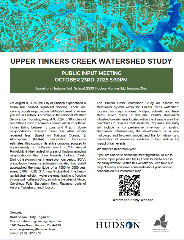 year event in the hardest-hit areas of Hudson along the easterly portions of the City including neighborhoods that drain towards Tinkers Creek. The heavy rainfall strained stormwater systems, leading to flooding throughout northeast Ohio, including the cities of Akron, Cuyahoga Falls, Barberton, Kent, Ravenna, parts of Aurora, Twinsburg, and Hudson.