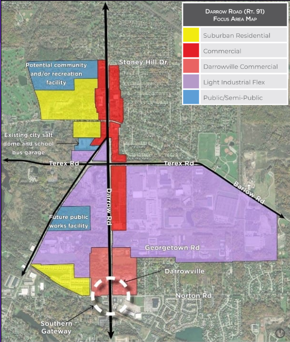 - The east side of Darrow Road, south of Terex Road, has the opportunity for new development to enhance the streetscape and soften the industrial scale of this portion of the corridor." (pg.70)